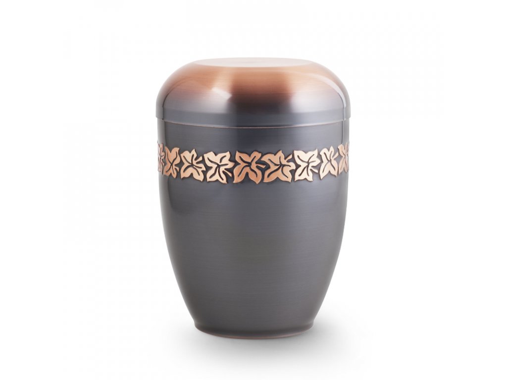 Jednoduchá medená urna, ktorá má galvanizovaný povrch. Urnu zdobí pás brečtanových listov.
