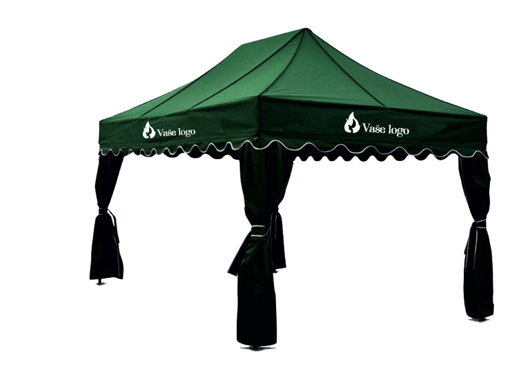 Cena zahŕňa OPLÁŠTENIE - textil vrátane dekorácií nôh, volán na streche stanu, logá alebo motívy zo všetkých 4 strán,