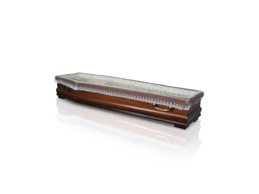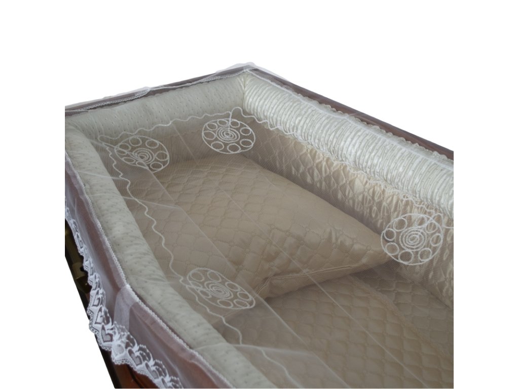 - zdobená výšivkou v pohľadovej časti truhly, vzor lemuje okraje truhly. Krajka je našitá v spodnej časti prikrývky a presahuje okraje truhly.