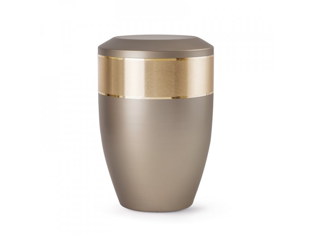 Kovová urna Aurum, je s výrazným širokým zlatým prstencom so zlatými pruhmi po jeho okrajoch. Urna má krásnu svetlohnedú farbu s jemne ružovým nádychom a perleťovým povrchom.